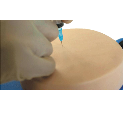采用进口塑胶材料,皮肤柔软有弹性,配有布质松紧带,可以穿戴在病人身体的特定部位,如腹部、大腿、上臂等,进行胰岛素药物的自我注射,长度和紧度可以调节。模块的厚度可以允许使用不同规格的注射器进行穿刺,背面配有硬质板,可以防止出现注射练习时模块扎穿的情况。